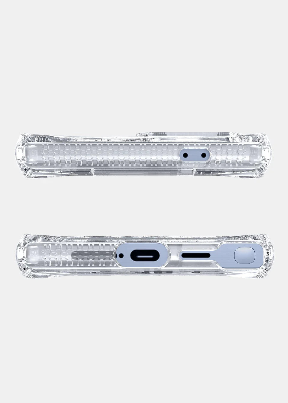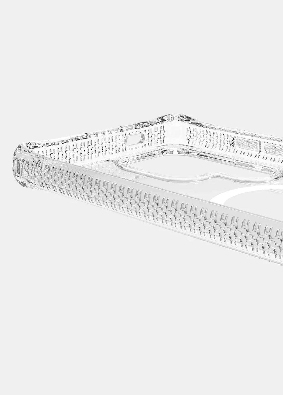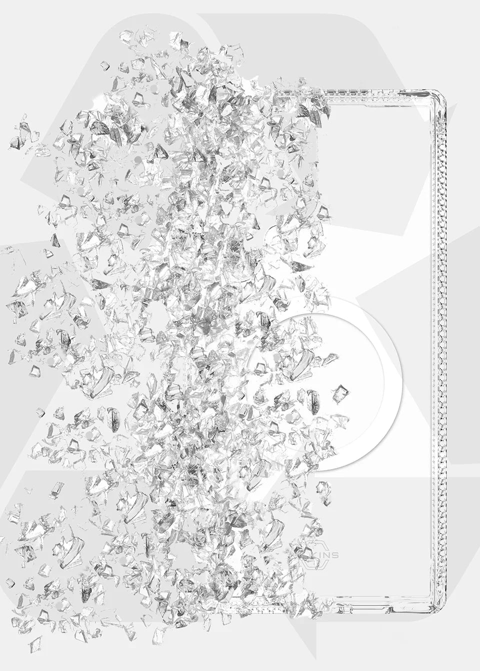 HYBRID_R // CLEAR has built-in magnets and is certified by the Global Recycled Standard for using 100% recyclable materials and produced with sustainably. It delivers premium drop protection and anti-yellowing antimicrobial defense.