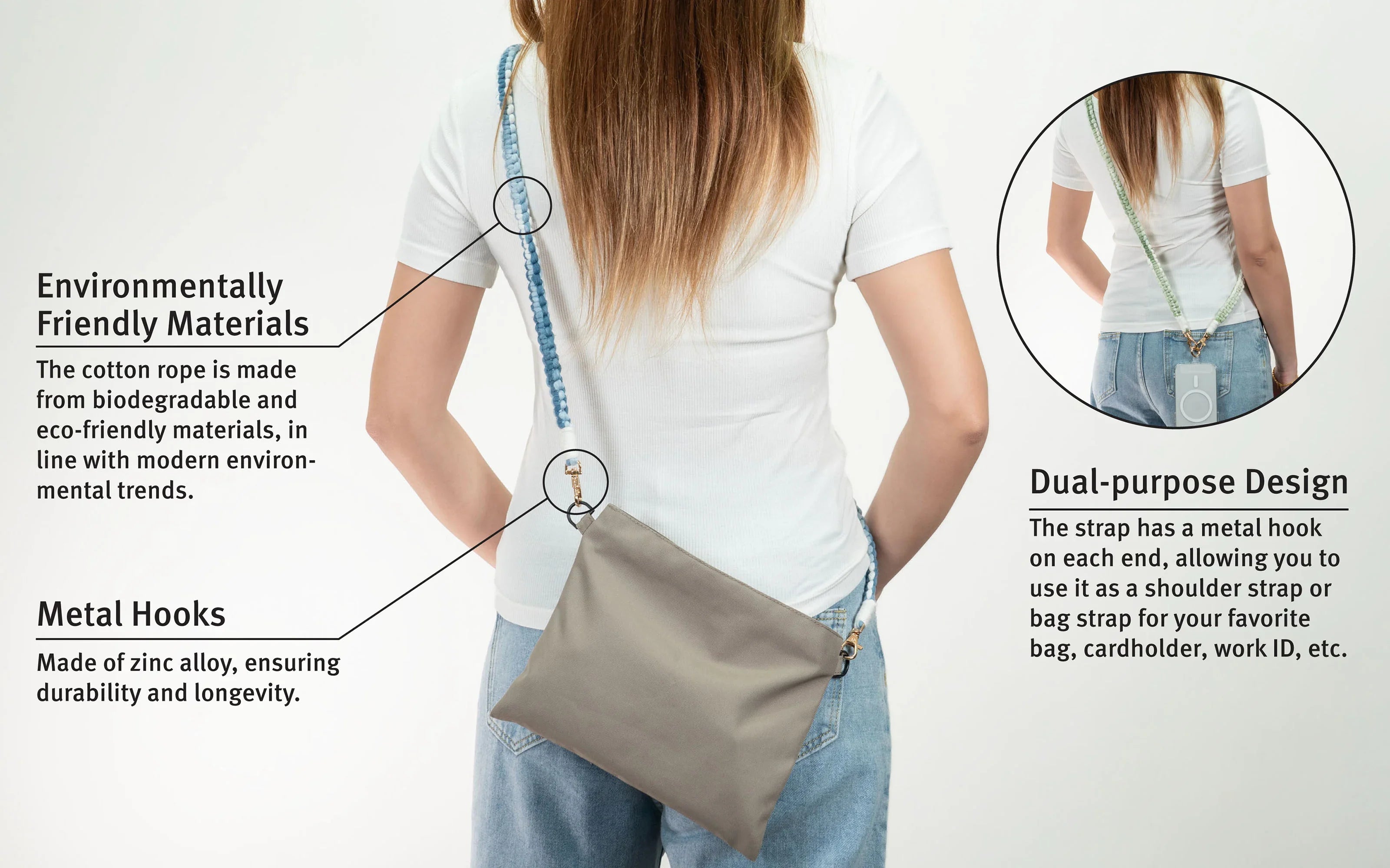 - Dual-purpose design; the strap has a metal hook on each end, allowing you to use it as a shoulder strap or bag strap for your favorite bag, cardholder, work ID, etc.