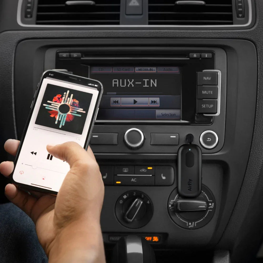 - DUAL CONNECTION: Lets two people listen to the same movie, podcast, or music with their favorite wireless headphones or earbuds. AirFly Pro adds the ability to stream music from your iPhone to an AUX IN in a car or speaker.