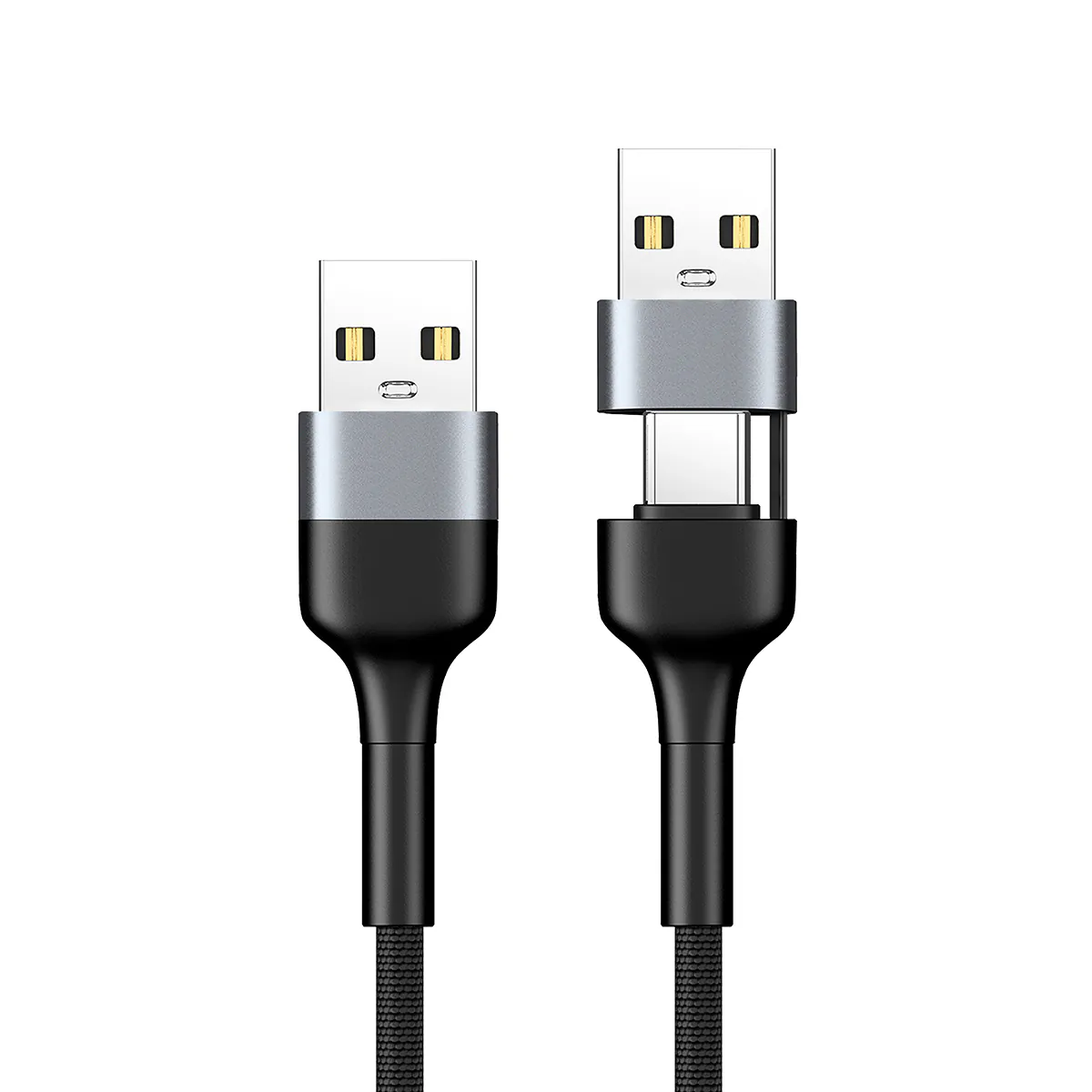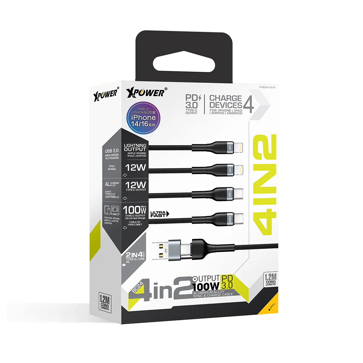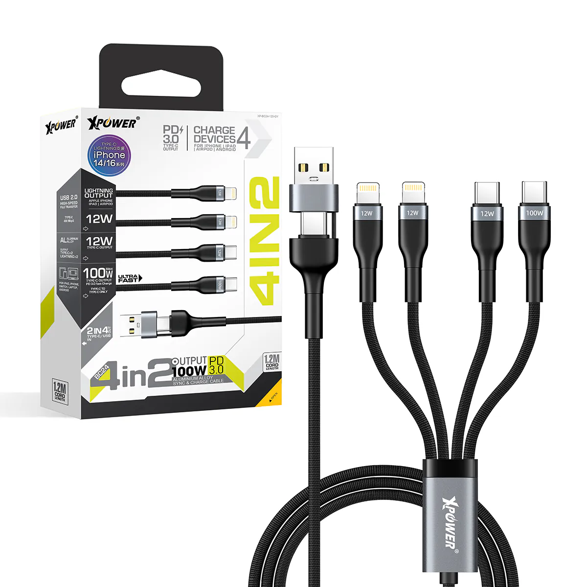 BC24 8 IN 1 2IN 4 OUT 100W PD3.0 Aluminium Alloy Sync & Fast Charge Cable 6 in 1 design: Input:Type-C+USB-A, Output: 2xType-C+2xLightning2 in 4 Out: Charge 4 devices simultaneouslySupport 100W(Max.) PD 3.0 fast Charge(C>C)Support USB 2.0 480 Mbps high-speed file transfer(Type-C only)High quality pure copper cableDurability aluminium alloy connectorNon-tearable nylon cableSafety certificate:Length: 1.2m