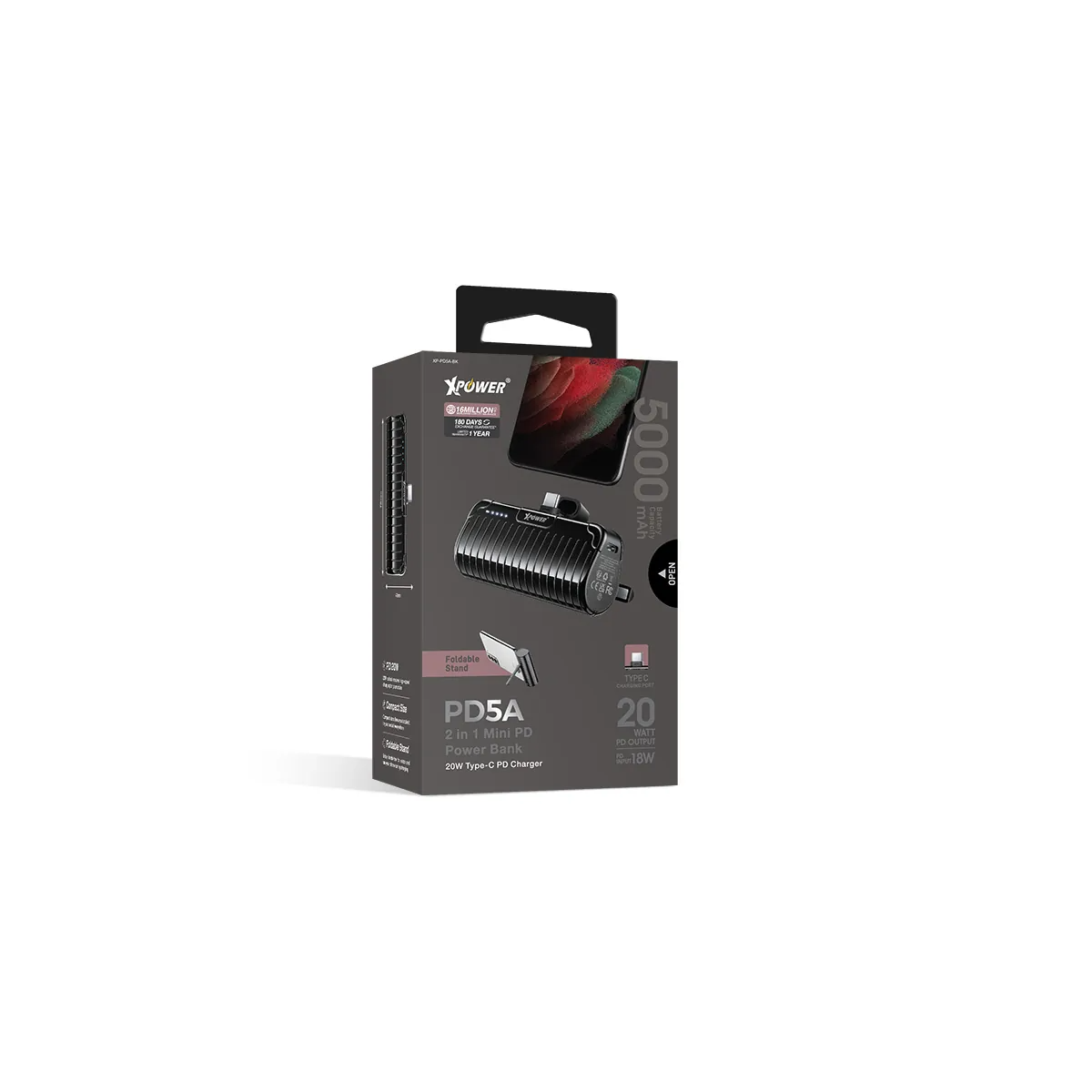 XPower PD5A 2 In 1 5000mAh Mini Type-C 20W Power Bank with Foldable Stand-Black